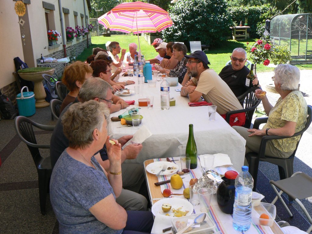 Les 15 marcheurs bénéficièrent d’une météo fort agréable. Dans une ambiance sympathique, 5 autres adhérents les rejoignirent pour le pique-nique au Champ Bigot chez Catherine et Joël Touchet, qui les reçurent dans leur propriété à côté de leur parc animalier.